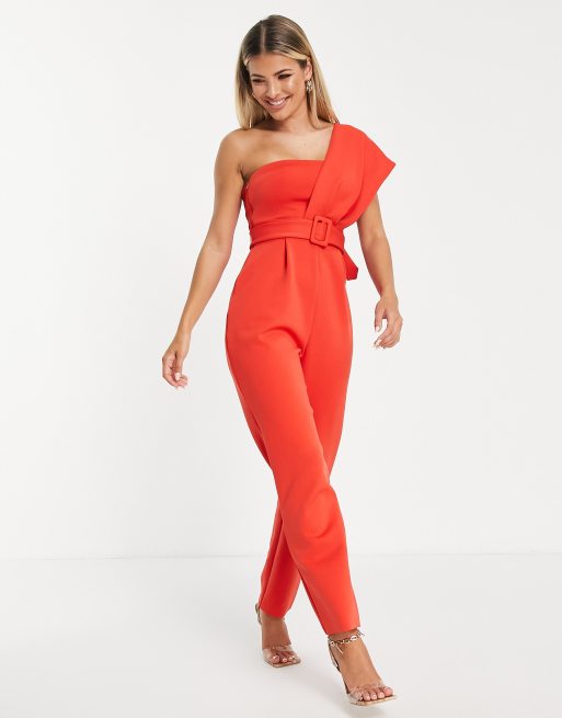 ASOS DESIGN one shoulder scuba belted jumpsuit in red