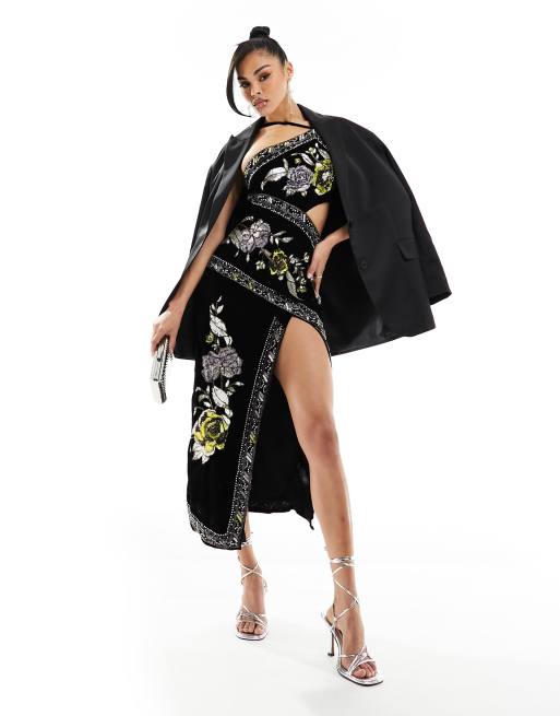 ASOS DESIGN one shoulder velvet midi dress in floral sequin embellishment in black