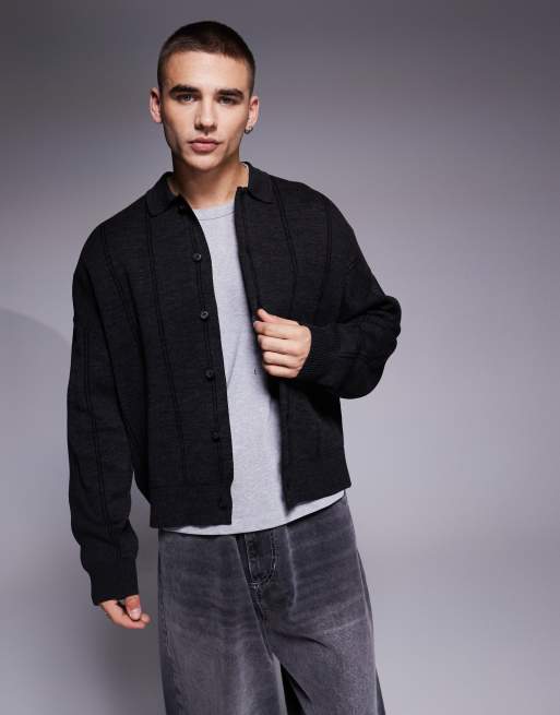 ASOS DESIGN oversized boxy fit knit polo sweater with stripe in heathered charcoal