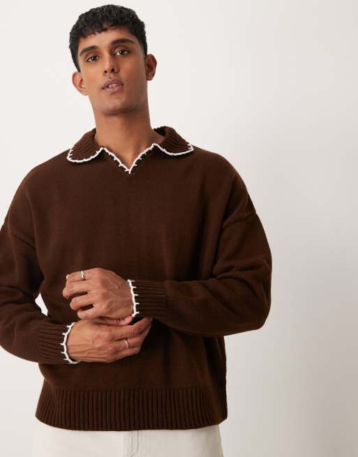 ASOS DESIGN oversized boxy fit knitted notch neck sweater with blanket stitch in brown