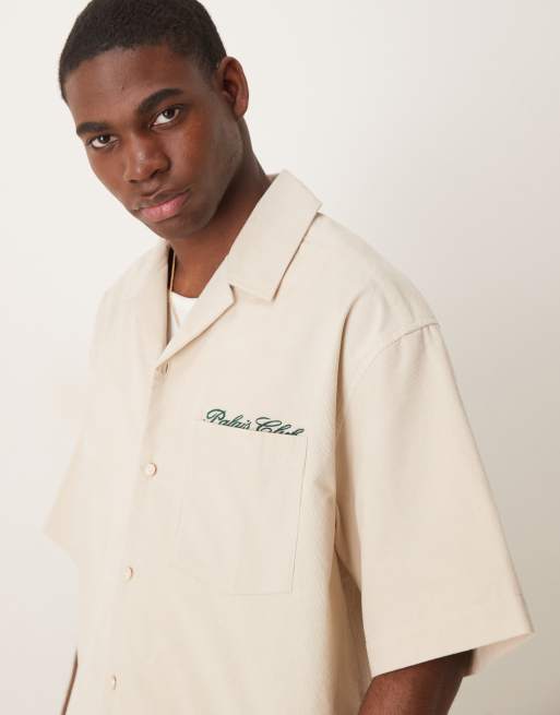 ASOS DESIGN oversized corduroy shirt with chest embroidery in cream