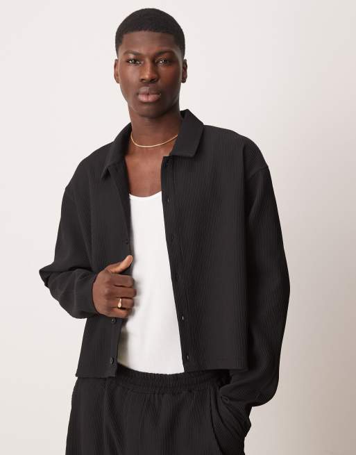 ASOS DESIGN oversized crop plisse shirt in black - part of a set