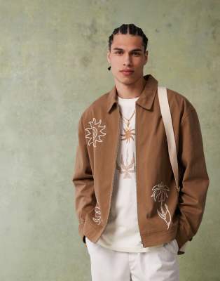 ASOS DESIGN oversized embroidered harrington jacket in camel