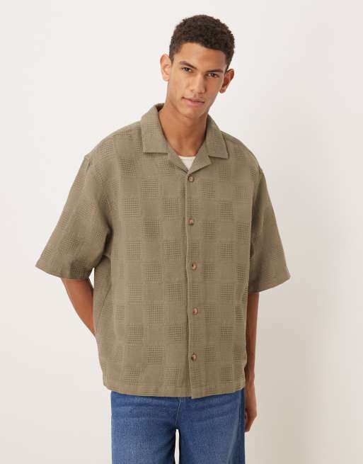 ASOS DESIGN oversized half sleeve camp collar grid textured shirt in khaki
