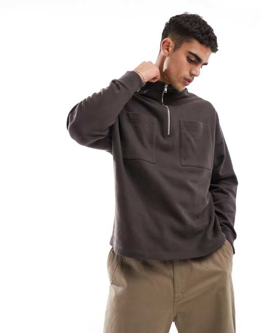 ASOS DESIGN oversized half zip sweatshirt with pocket in dark brown