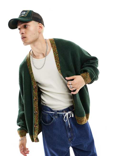 ASOS DESIGN oversized knit contrast trim fisherman ribbed cardigan in dark green