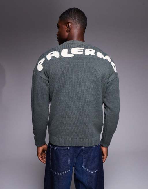 ASOS DESIGN oversized knit crew neck sweater with Palermo back print in charcoal