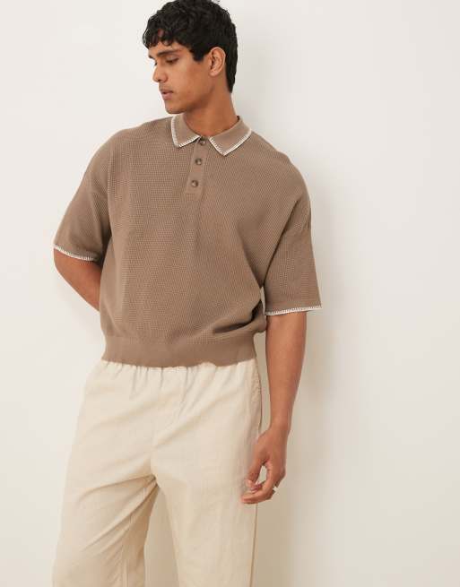 ASOS DESIGN oversized knit polo shirt with blanket stitch details in brown
