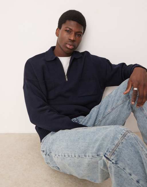ASOS DESIGN oversized knit quarter zip polo with chest pockets in navy