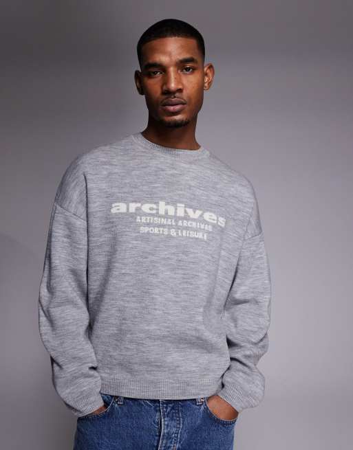 ASOS DESIGN oversized knit sweater with archives graphic in gray
