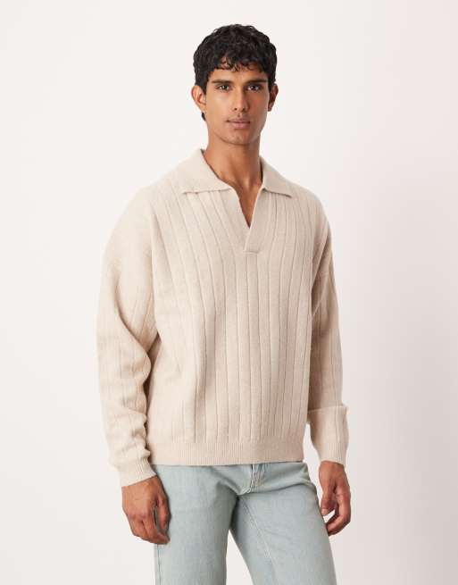ASOS DESIGN oversized long sleeve knit ribbed notch neck polo in stone