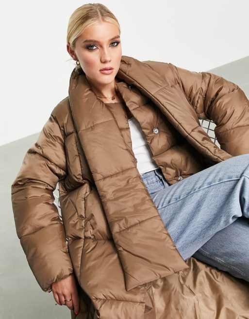 ASOS DESIGN oversized puffer jacket with scarf in dark camel