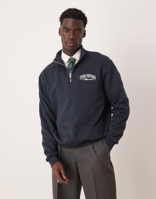 ASOS DESIGN oversized quarter zip sweatshirt with chest print in navy