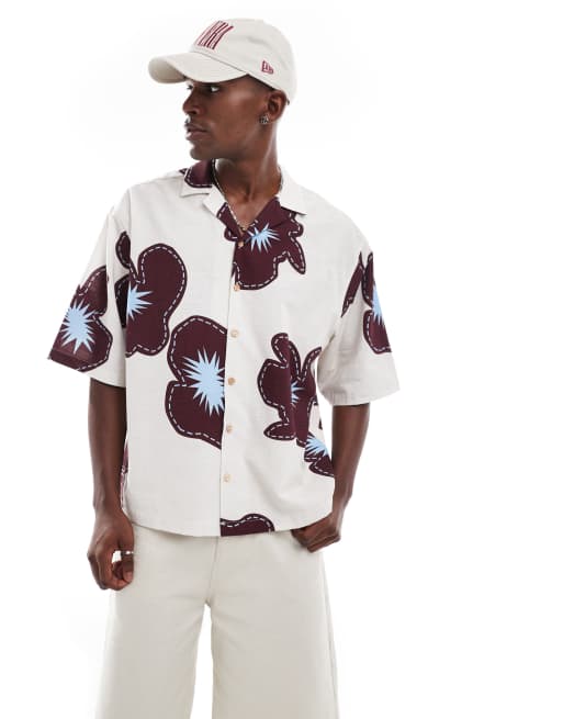 ASOS DESIGN oversized shirt with half sleeves in cream flower print