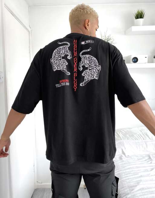 ASOS DESIGN oversized t-shirt with back tiger and text print in black
