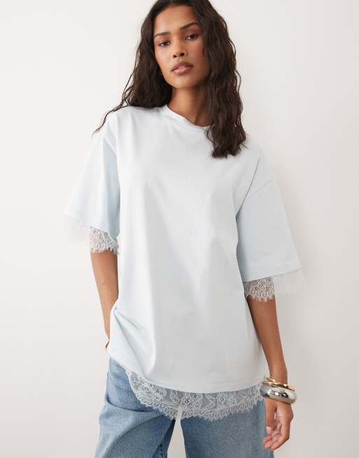 ASOS DESIGN oversized T-shirt with lace hem in light blue