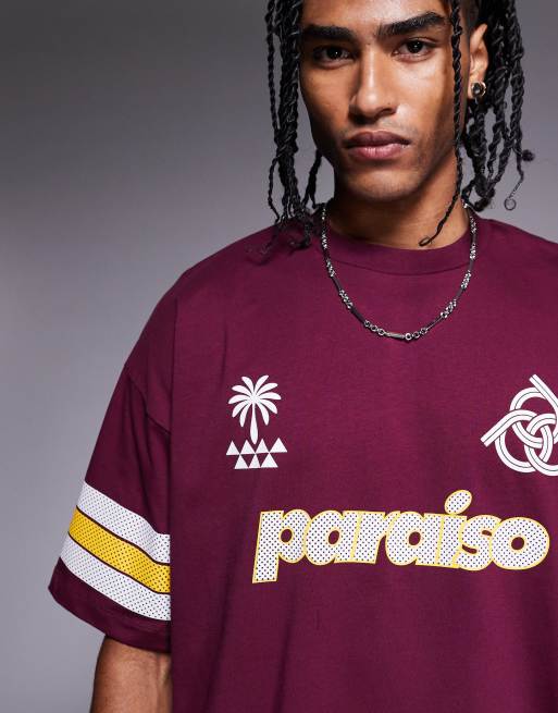 ASOS DESIGN oversized t-shirt with paneling and athletic graphic in burgundy