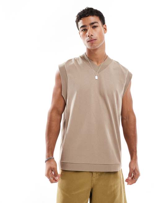 ASOS DESIGN oversized V-neck tank with contrast seams in stone