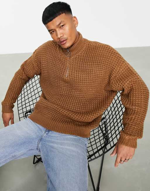 ASOS DESIGN oversized waffle knit half zip sweater in tan