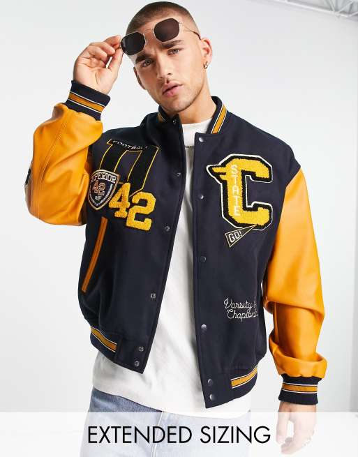 ASOS DESIGN oversized wool look varsity bomber jacket with contrast leather look sleeves in navy