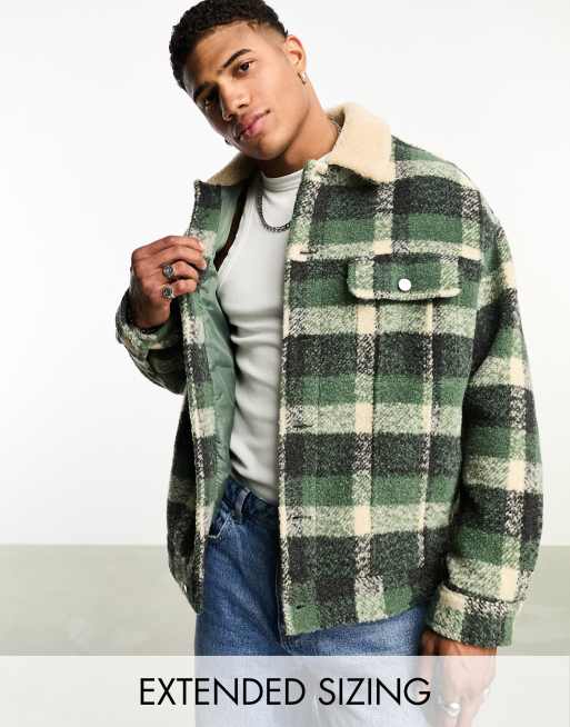 ASOS DESIGN oversized wool look western jacket in green check with borg collar