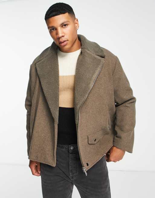 ASOS DESIGN oversized wool mix biker jacket with sherpa borg collar in beige