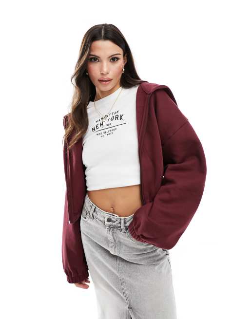 ASOS DESIGN oversized zip up crop hoodie in burgundy