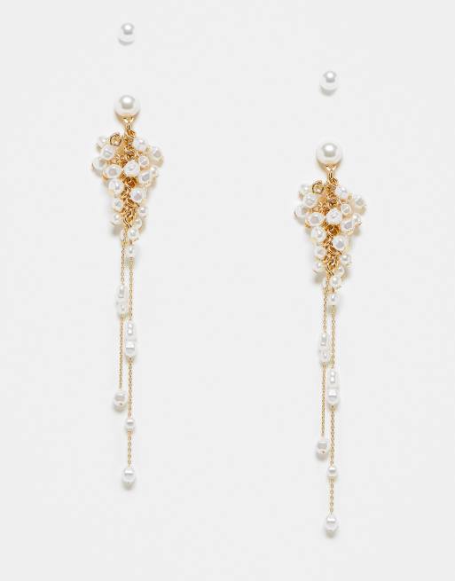 ASOS DESIGN pack of 2 drop and stud earrings with waterfall faux pearl design in gold tone