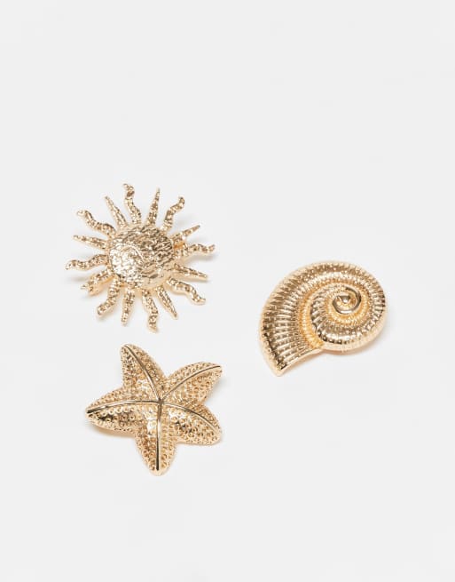 ASOS DESIGN pack of 3 brooches in sun, shell and starfish design in gold tone