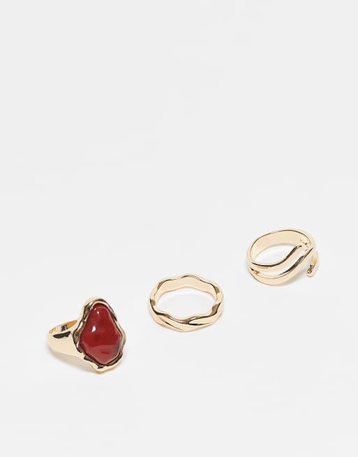 ASOS DESIGN pack of 3 rings with semi precious style red stone in gold tone
