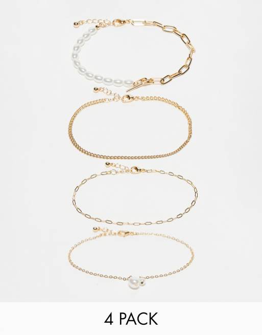 ASOS DESIGN pack of 4 anklets with faux pearl and mixed chain in gold tone