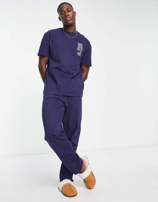 ASOS DESIGN pajama set with t-shirt and pants in navy with embroidery