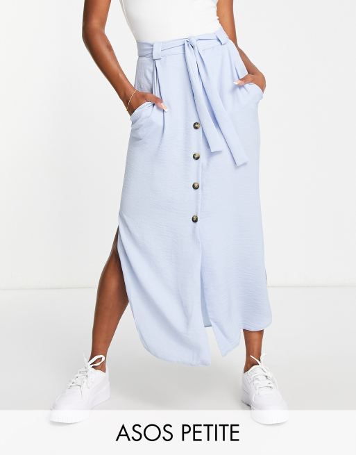 ASOS DESIGN Petite belted button through midi skirt in pale blue