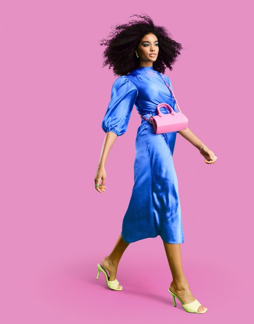 ASOS DESIGN pleat cowl neck satin midi tea dress with puff sleeve in cobalt