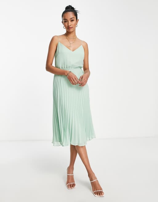 ASOS DESIGN pleated cami midi dress with drawstring waist in soft green