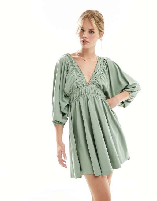 ASOS DESIGN plunge elastic tea mini dress with ruched waist in light green