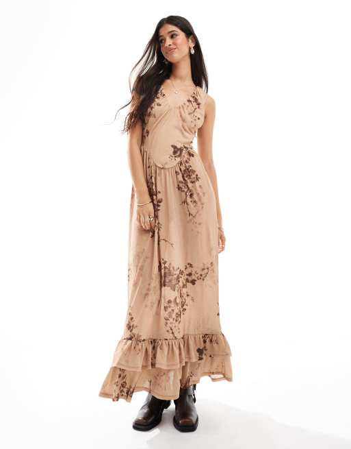 ASOS DESIGN plunge tiered midi dress with gathered waist in boho print