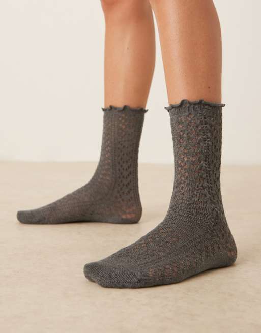 ASOS DESIGN pointelle ankle socks with frill edge in charcoal gray