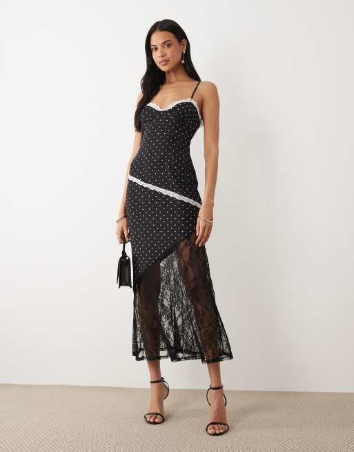 ASOS DESIGN polka-dot printed mesh awkward length dress with lace panel hem in black