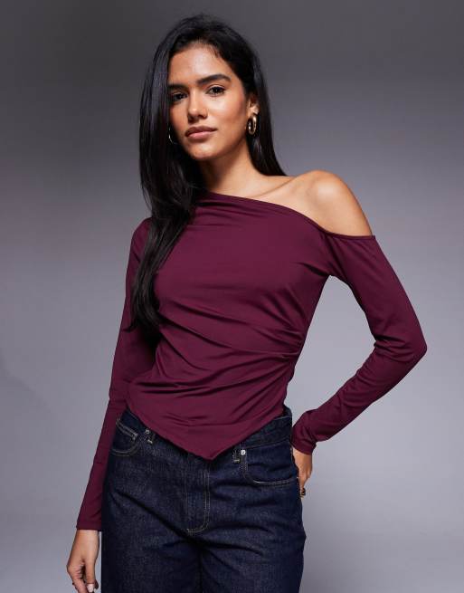 ASOS DESIGN polyamide slinky one shoulder draped asymmetric top in berry