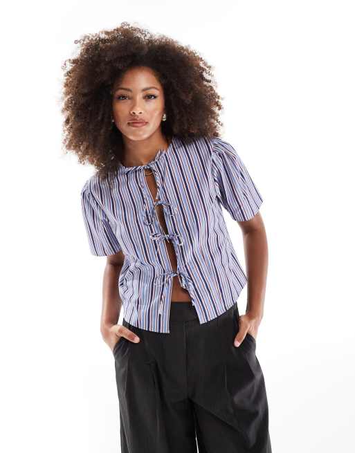 ASOS DESIGN poplin tie front blouse in blue stripe