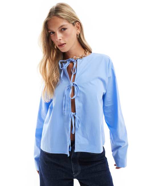 ASOS DESIGN poplin tie front long sleeve blouse in blue