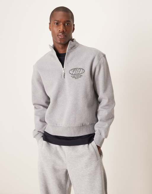 ASOS DESIGN premium heavyweight boxy quarter zip sweatshirt 400gsm with tonal print in gray heather
