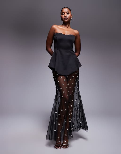 ASOS DESIGN premium moulded dress with embellished maxi skirt in black in scuba-style fabric
