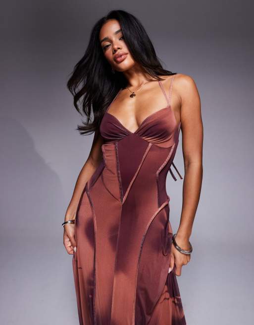 ASOS DESIGN printed mesh maxi dress with exposed seam detailing in brown blurred floral print