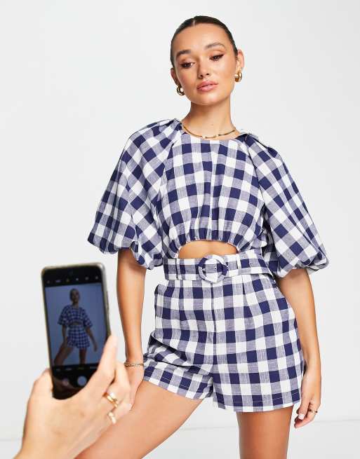 ASOS DESIGN puff sleeve cut out romper in gingham print