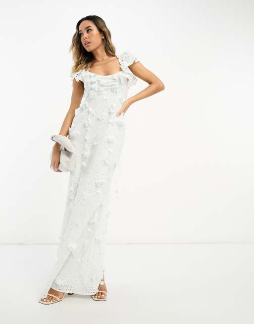 ASOS DESIGN puff sleeve eyelet cut out midi dress with floral corsage detail in light blue