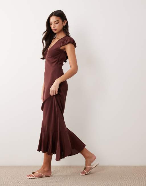 ASOS DESIGN puff sleeve V-neck maxi tea dress in chocolate
