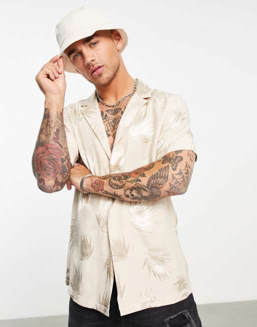 ASOS DESIGN regular one button satin shirt with jacquard palm print