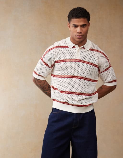 ASOS DESIGN relaxed boxy fit crochet knit polo with striped pattern in ecru
